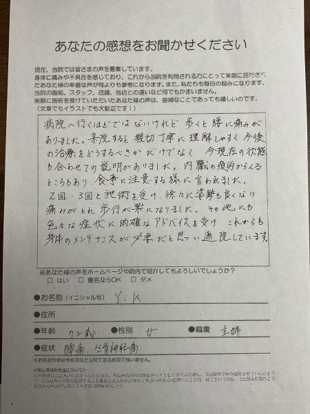 病院に行くほどではないけれど歩くと腰に痛みがありました。 来院すると親切丁寧に理解しやすく今後の治療をどうするべきかだけではなく 内臓の疲労からくるところもあり、食事に注意するように言われました。 2回、3回と施術を受け徐々に姿勢も良くなり痛みがとれ歩行が楽になりました。 その他にも色々な症状に的確なアドバイスを受け、これからも身体のメンテナンスが必要だと思い通院しています。 (Y・K 女性 72歳) |
