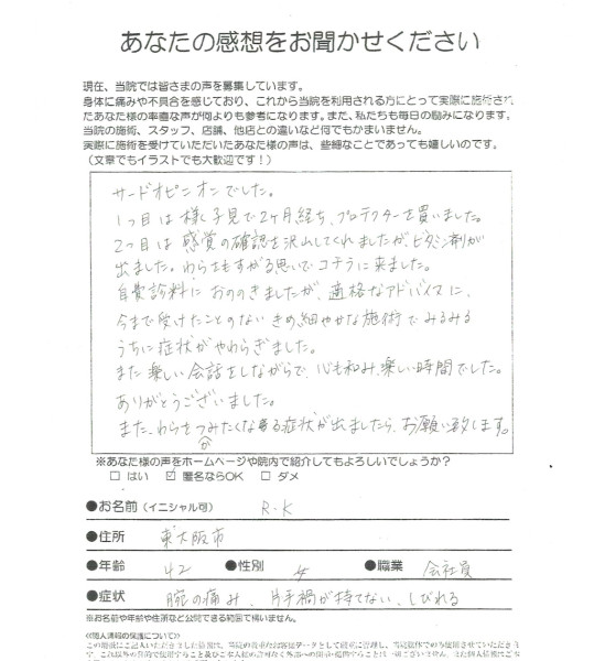 「ぎっくり腰が1回目の施術で改善!」 こちらにお世話になることになったきっかけは、掃除をしている時にぎっくり腰にな李、連絡させていただきました。 もちろん予約もなく、いきなりの電話にもその日のうちに診ていただき優しく施術していただき、翌日、翌々日と目に見えて楽になりました。 今までいくつかの整骨院に行きましたが、私にはこちらの整体院がバッチリ合ったようです。 日々のストレスや姿勢の悪さ等で先生を困らせるばかりですが、メンテナンスを兼ねてずっと通わせていただいています。 これからも宜しくお願い致します。